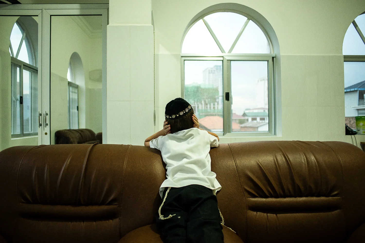 Zalman and his younger brother Shmulik outside their home in Phnom Penh, on their way to walk to Shul (the Jewish Center and Synagogue) down the street. Because the Butmans' observe the Sabbath and do not use transport for 24 hours, their home needs to be close to the center.